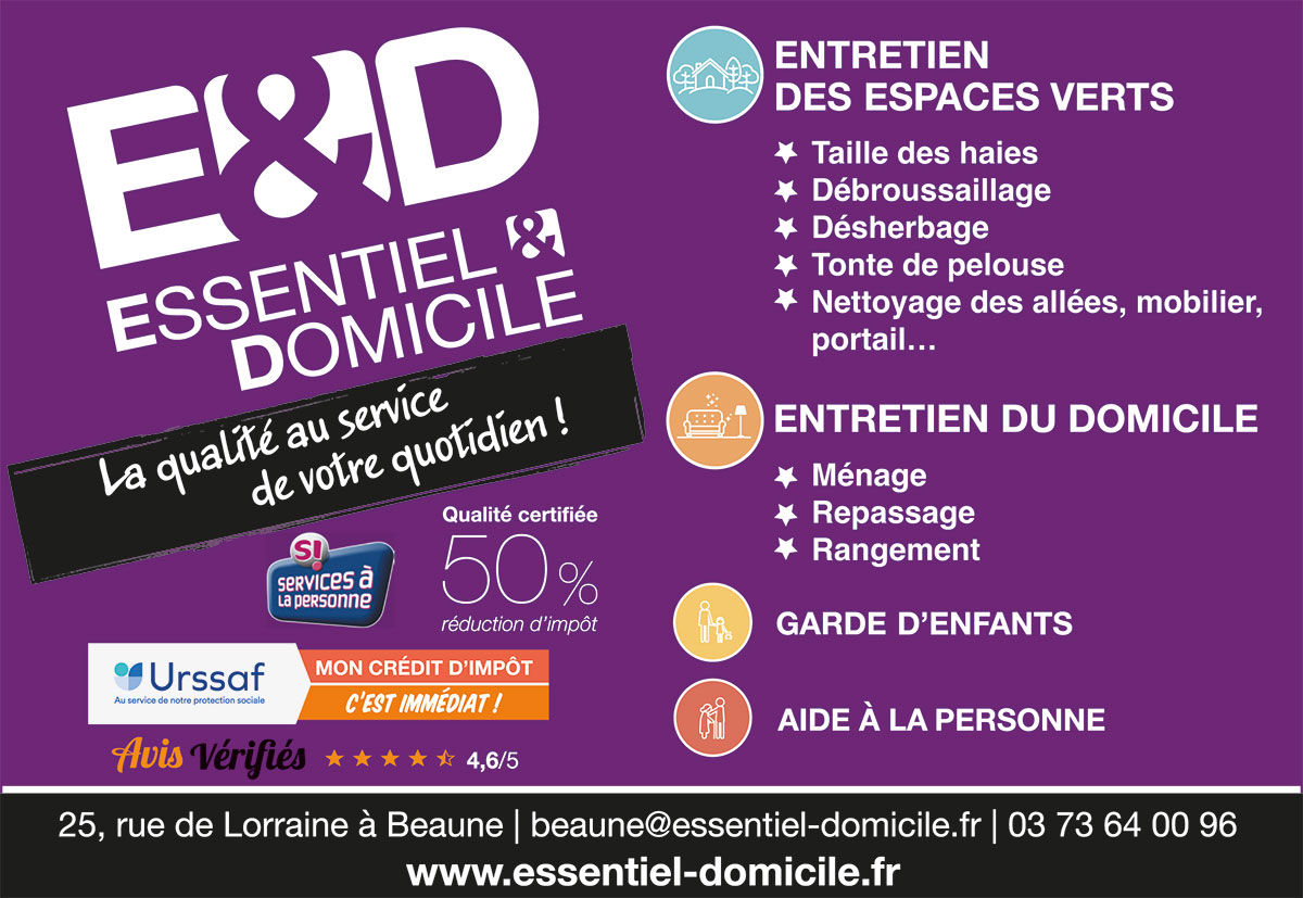 Essentiel & Domicile 25, rue de Lorraine à Beaune Tél. 03 73 64 00 96 www.essentiel-domicile.fr
