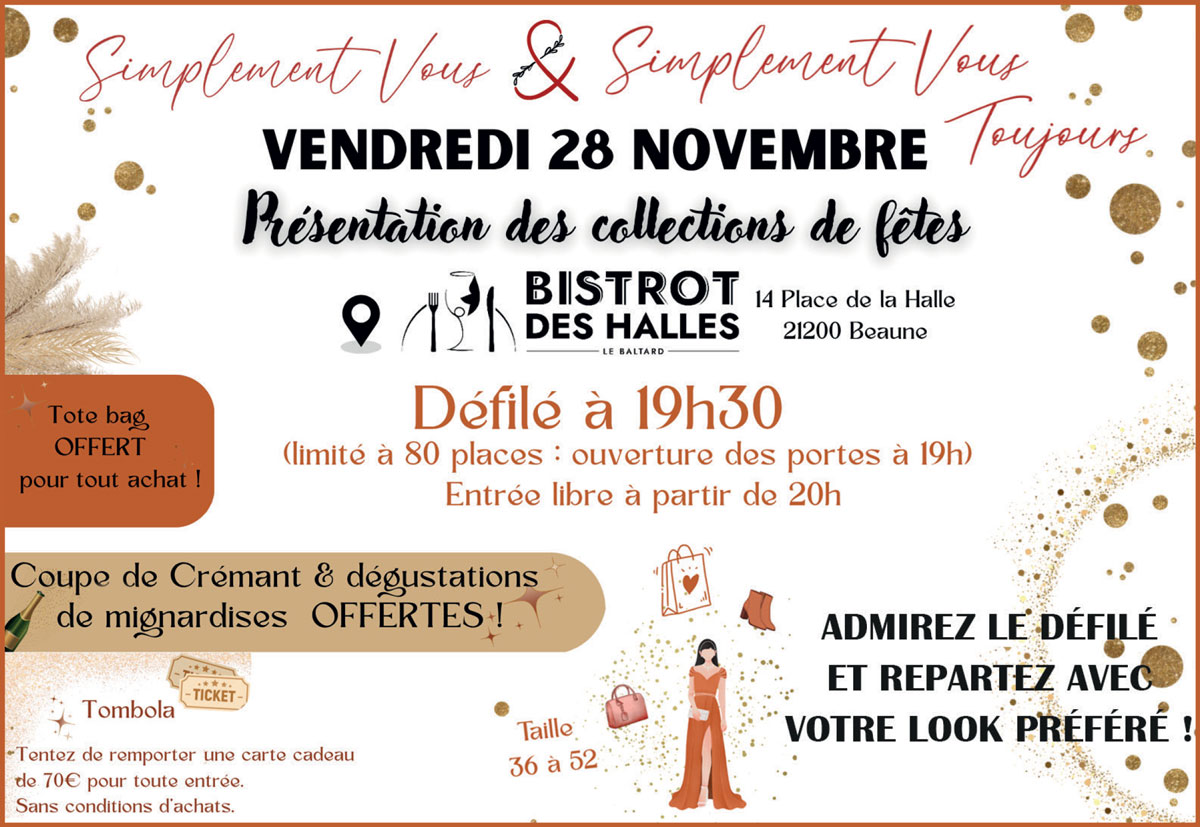 Le temps d’une soirée, le Bistrot des Halles se transforme en véritable temple de la mode pour mettre en lumière les collections de fêtes des boutiques Simplement Vous et Simplement Vous Toujours. L’occasion idéale de découvrir en avant-première les tenues qui illumineront votre fin d’année : robes scintillantes, jupes élégantes, pantalons tendance, chemises raffinées, vestes… De quoi composer votre total look préféré et repartir avec la tenue qui vous fera briller !