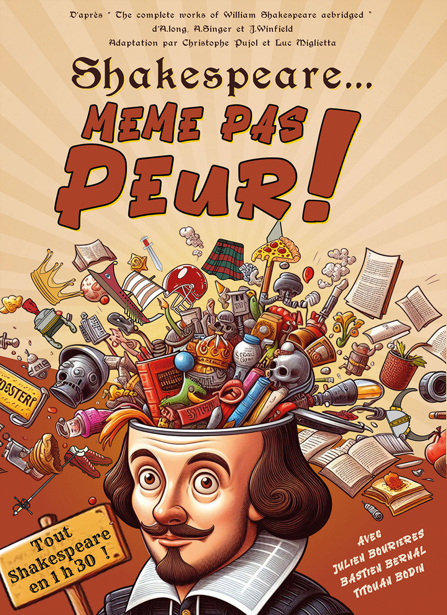 • Samedi 11 octobre à 20 h 30 : “Shakespeare… même pas peur”. Comédie à 3 personnages adaptée par Christophe Pujol et Luc Miglietta et mise en scène de Christophe Pujol (durée 1 h 30). Avec Julien Bourières, Bastien Bernal et Titouan Bodin. Adaptation de “The complete works of William Shakespeare abridged”, comédie américaine de Adam Long, Daniel Singer et Jess Winfield. Ensemble ils ont une mission : jouer l’intégralité des œuvres de William Shakespeare en 96 minutes ! Trois clowns-acteurs, une armoire et quelques accessoires, le chrono démarre pour une traversée tambour battant et secouée du répertoire du dramaturge anglais. Roméo et Juliette à la sauce italienne, Mac Beth en marionnettes ou Othello en rap façon Orelsan…