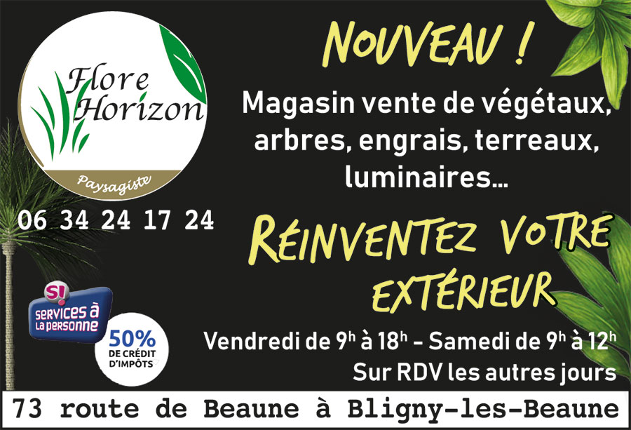 Flore Horizon – 06 34 24 17 24 – rue du Paquier Zone Artisanale à Bligny-lès-Beaune – www.florehorizon.paysagiste.com