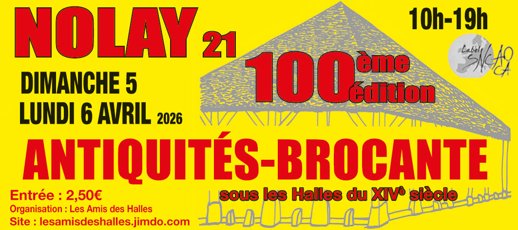 Organisée par Les Amis des Halles, la 100ème édition de la foire antiquités-brocante aura lieu les dimanche 5 et lundi 6 avril prochains de 10 h à 19 h sous les Halles Médiévales de Nolay.