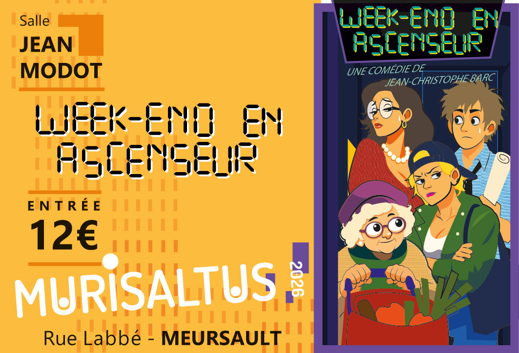 La troupe de théâtre Murisaltus vous propose de découvrir sa nouvelle pièce “Week-end en ascenseur” de Jean-Christophe Barc lors des 10 réprésentations qui se dérouleront en avril et en mai salle Jean Modot (rue Labbé à Meursault).