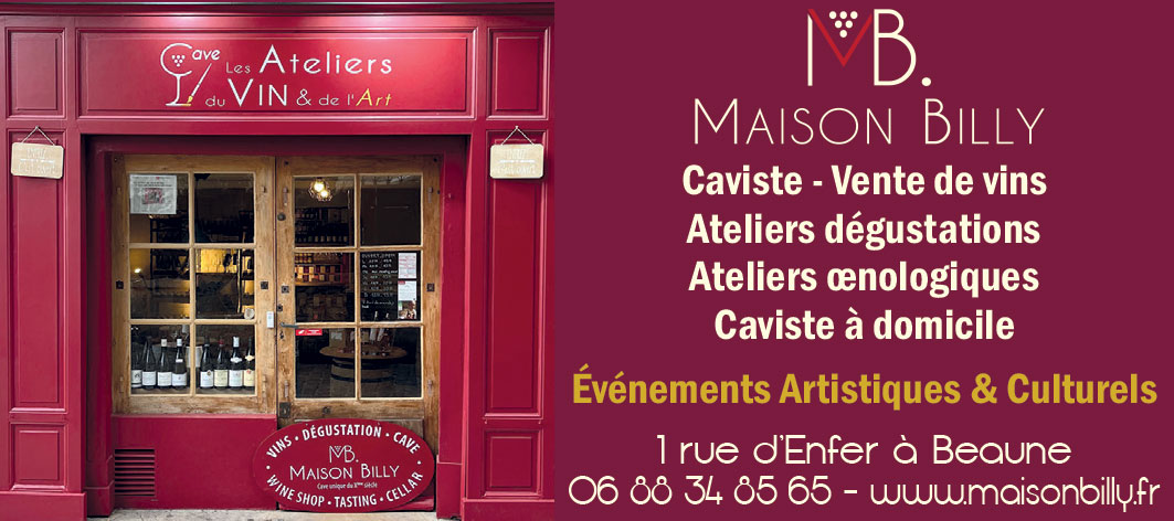 En 2022 à Corcelles-les-Arts, Benjamin crée la Maison Billy, reflet de sa passion pour le vin. Aujourd’hui à Beaune, près de la Basilique Notre-Dame, il inaugure Les Ateliers du Vin et de l’Art. Dès l’entrée, une première pièce chaleureuse vous accueille avec une sélection pointue de près de 300 références, issues de Bourgogne mais aussi d’autres régions. C’est dans ce cadre convivial que se déroulent les ateliers de dégustation de vins de Bourgogne (dès 9 €, sur des formats de 1 à 2 heures, en petit comité, à partir d’une personne, accessibles à tous).