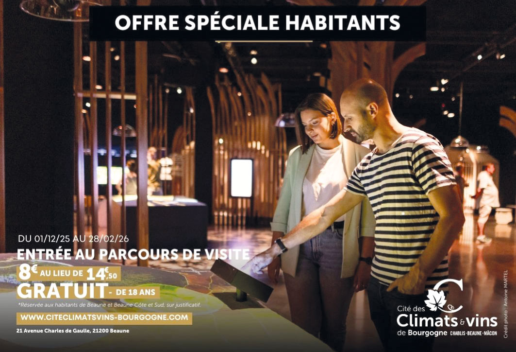 Offre Spéciale Habitant : Vous habitez Beaune ou son agglomération ; jusqu’au 28 février 2026 profitez d’un tarif préférentiel pour découvrir La Cité des Climats et vins : adulte 8 € au lieu de 14,50 €, gratuit pour les moins de 18 ans.