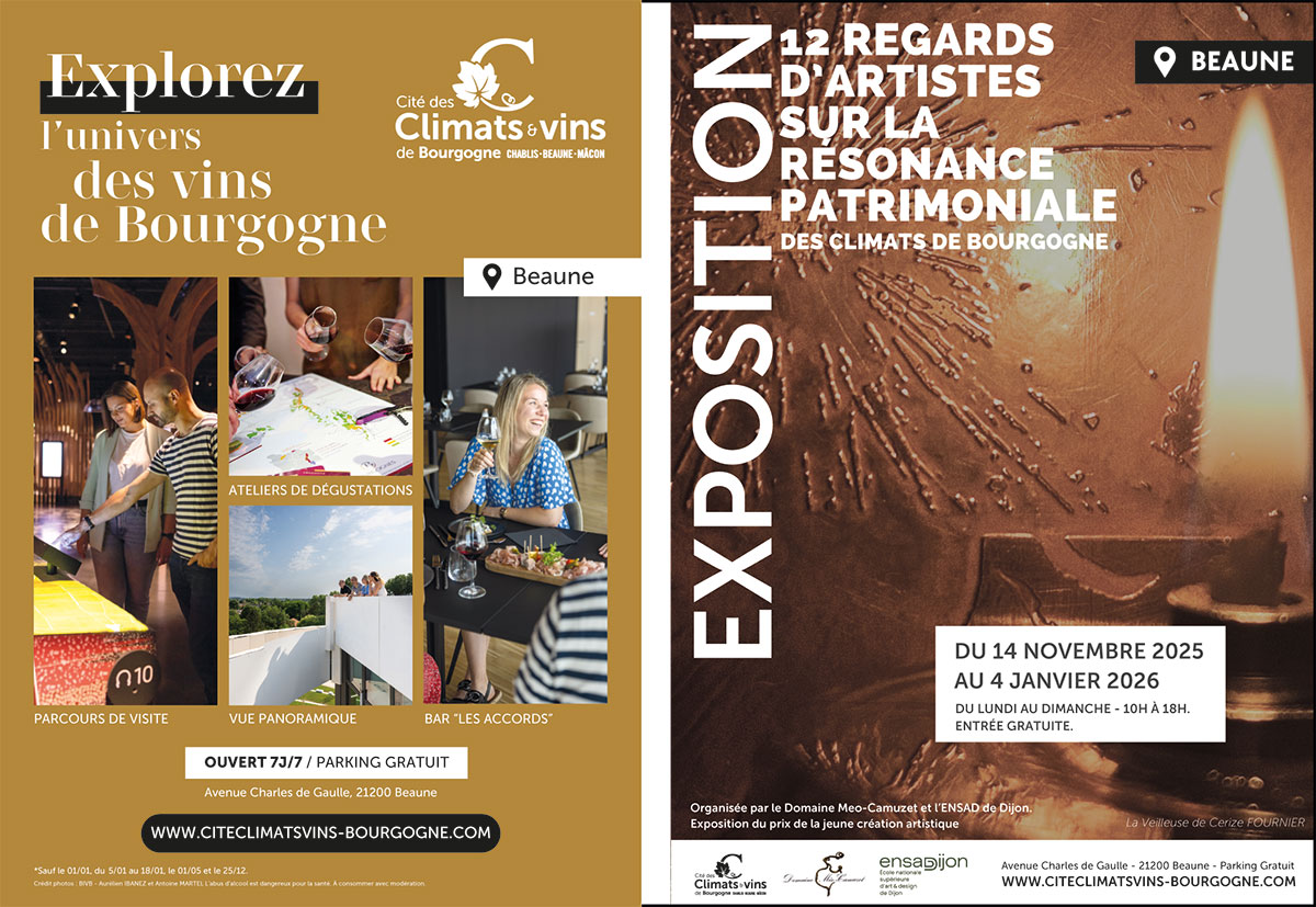 • Exposition artistique Meo-Camuzet. Organisée par le domaine Méo-Camuzet et l’ENSAD (École Nationale Supérieure d’Art et Design de Dijon), venez découvrir, du 14 novembre 2025 au 4 janvier 2026, les œuvres contemporaines réalisées autour de la thématique de la viticulture, des vignobles et des “Climats” de Bourgogne. Accès gratuit.